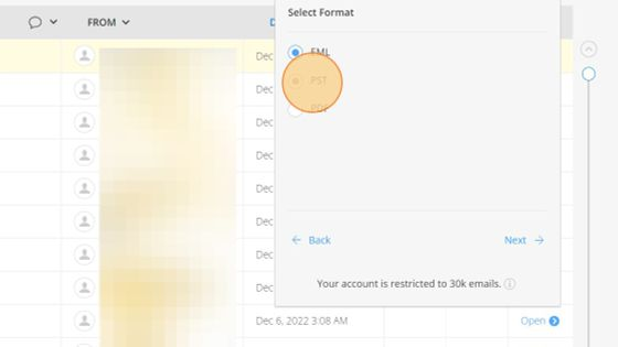 3. Select .PST or desired format and click Next (A PST takes time to create but is the default for MS Outlook).