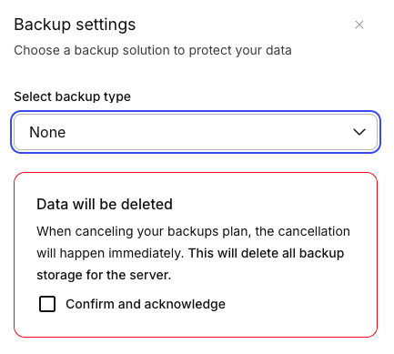 7. You’ll see a pop-up warning you that removing Acronis Backups will remove both the plan and all of your current Acronis Backups. This cannot be undone! Please be sure you have reliable copies of any data in the backups before removing Acronis Backups from the server. Click the checkbox next to Confirm and acknowledge. Finally, click Remove backups to remove Acronis backups from your server.