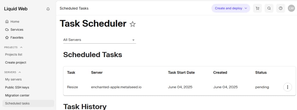 - Navigate to https://portal.liquidweb.com/servers/scheduled-tasks
