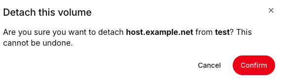1. You will see a confirmation dialog that asks if you want to detach the volume. Confirm that the volume has been unmounted on the server, then click Confirm to detach the volume from the server.