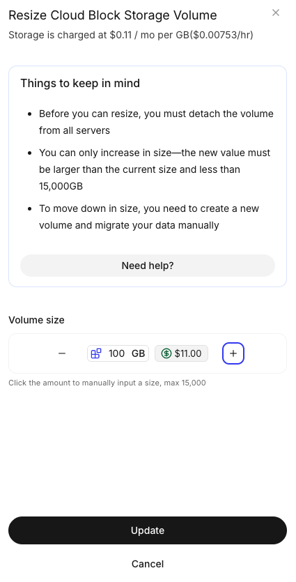 2. Choose the new size that you want for the volume and click Update to resize the volume.