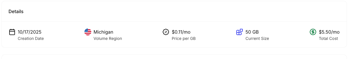 4. At the top of the page, you’ll see the details section. This section provides details about the volume, including the name, region, size, and current Total Cost of the volume. (Please note: pricing is subject to change. The pricing in this article is only an example).