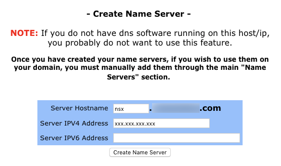 - In the Create Name Server section, enter the Server Hostname and Server IP Address, then click Create Name Server.