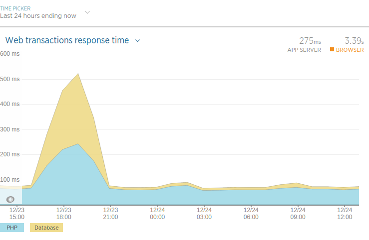 To illustrate this point, let’s look at an example from a large wiki website. The chart below, generated by NewRelic, shows the server response times. You’ll notice that the server typically responds in under 100 milliseconds (0.100 seconds). During idle periods, PHP takes about 68ms to complete, and MySQL responds in approximately 10ms.