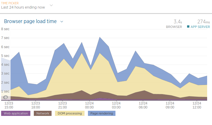 Almost all the time it takes to load a website is spent traveling across the network and rendering within the client’s browser. What about server load spikes affecting page loading time? For the most part, the server’s load average remains well under 0.30, indicating stable performance.
