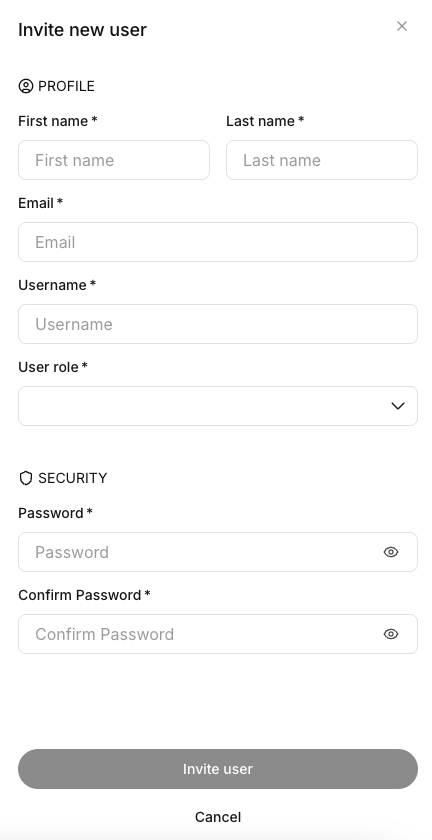 - Enter the required information in the remaining fields and click Invite User to create the user.
