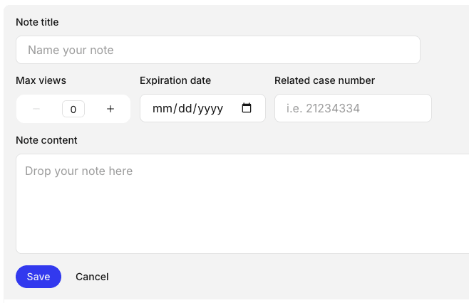 5. Provide a name for the note. You can also set a maximum number of views (the default is a one time view), an expiration date, and relate the note to a case number if you want. Enter your sensitive information in the Note Content box.