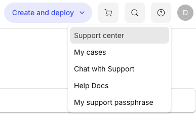 Clicking the Question mark icon will open the Support drop-down menu. From this menu, you can view your Support Cases, open a chat, view the Help Docs collection, or access your Support passphrase.