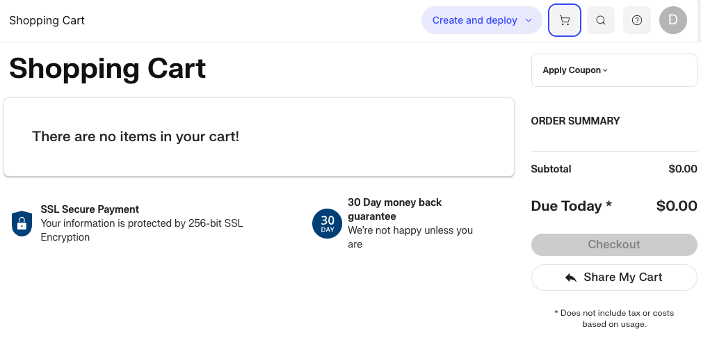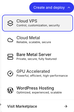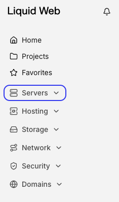 The create and deploy drop-down menu gives you quick access to adding servers to your account. You can also find a link to the Liquid Web marketplace where you can browse all of our products.