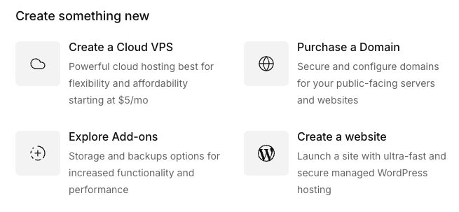 Below the welcome are links to make adding common items to your account as easy as possible. VPS purchasing, domain registration, add-ons, and WordPress hosting can all be accessed from this part of the home screen.