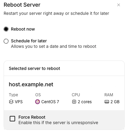 9. You can also choose to enable the Force Reboot option if the server is unresponsive. This is the equivalent of powering off the server and is not recommended unless the server is unresponsive.
