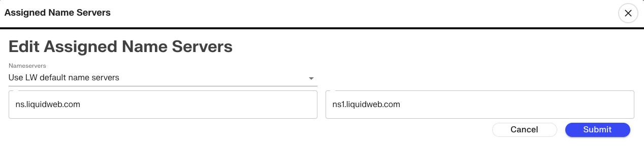- From the drop-down menu, choose Liquid Web’s default nameservers, Liquid Web’s default un-branded nameservers, or Custom Nameservers. If you are using custom nameservers, enter them in the boxes provided. Click Submit to save your changes. (Note: nameserver changes may take up to 48 hours to propagate throughout the Internet).