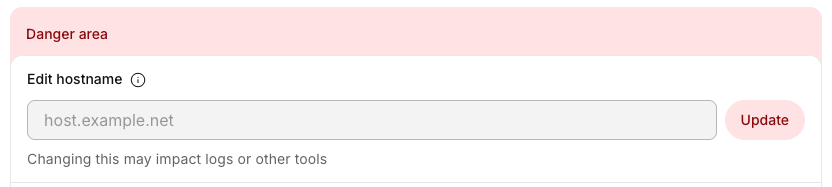 If you need to change your server hostname, you can do this in the Edit hostname block. Note: this functionality is included in the “Danger Area” portion of the General settings as changing the hostname of the server can impact logging, email delivery and a number of other important systems.