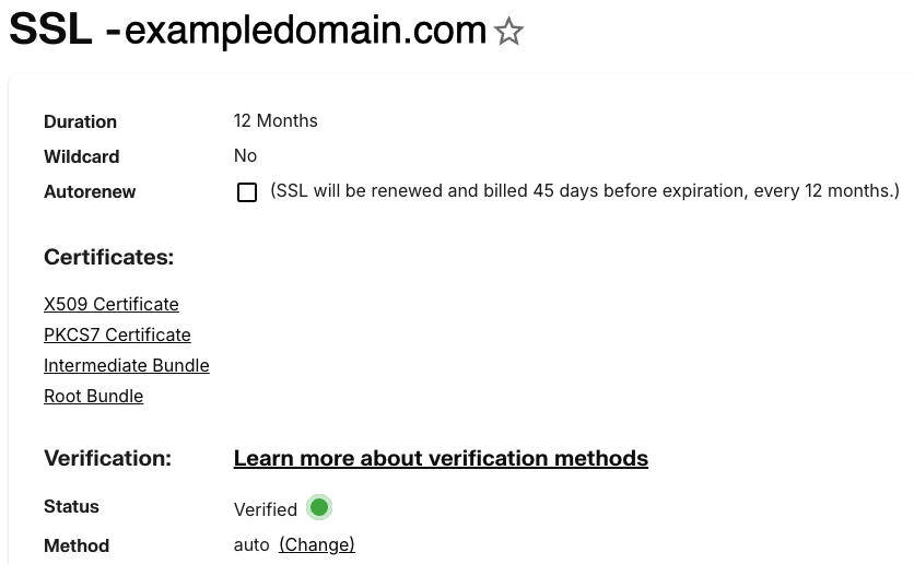 7. This page will display how long the Certificate is valid and if it has been verified. If the status is Verified, you’re ready to install your certificate! If you don’t install your certificate, your SSL renewal won’t be complete. If your certificate is not verified, you’ll need to verify it before installing your certificate. (NOTE: you can also enable Autorenew on this page so your SSL renews automatically in the future).