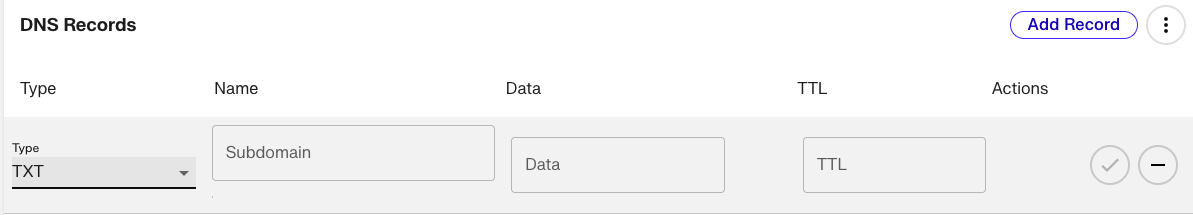 3. Click Add Record. Change the Record Type to TXT. Paste the TXT record data from the SSL page into the Data field and save the new record by clicking the checkbox. Once DNS propagates (it may take a little while), your record will be verified!