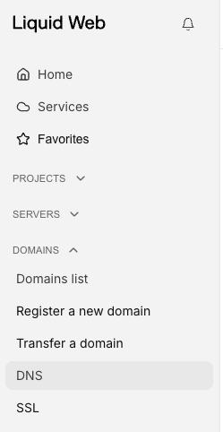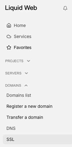 1. Log into your Liquid Web account. In left menu, find the SSL link under the Domains section.