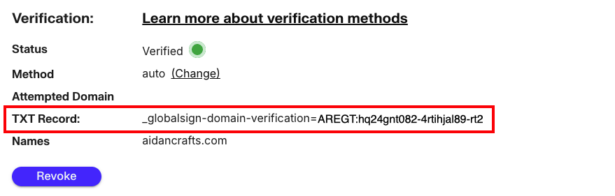 You choose this method when you order your certificate. If you want to change your verification method, know that you can only switch between DNS verification and meta tag verification.