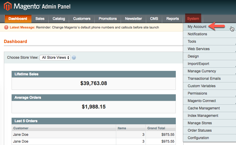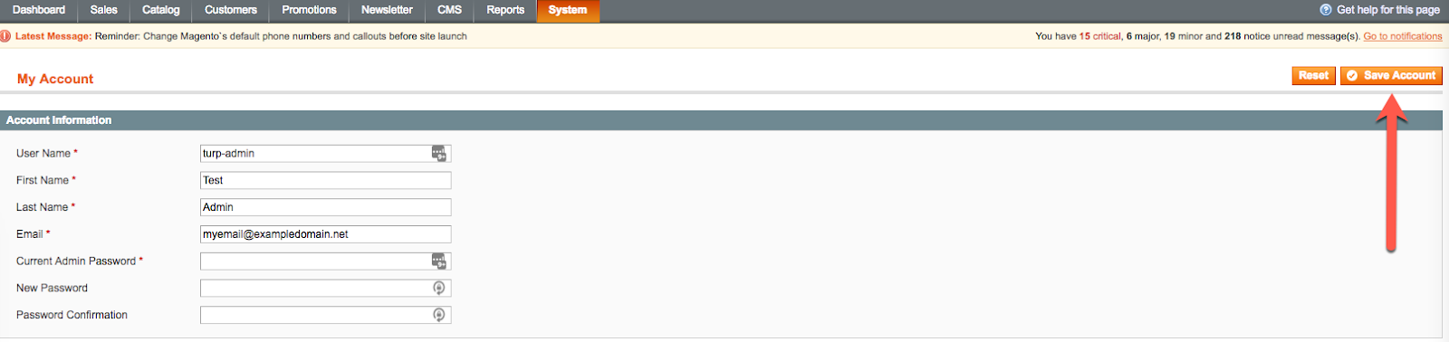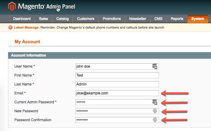 If you know the current username and password, but do not have access to the email account, you may use this method to change your password from within the Magneto Admin Panel.