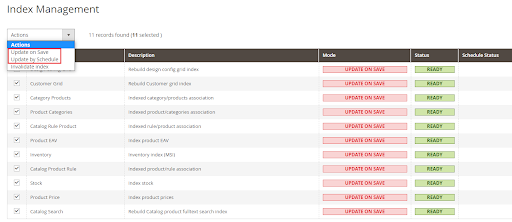 The first option allows the indexer to reindex in real-time, as changes are being made in the admin panel. When we select “Update by Schedule,” it proceeds with the reindex at a specified time, with the help of a Magento cron job. To access the index management panel, we need to go to:
