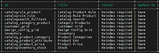 As we can see, a reindex is required for all indexers. So the last step would be to issue the indexer:reindex command to reindex and fix that up: