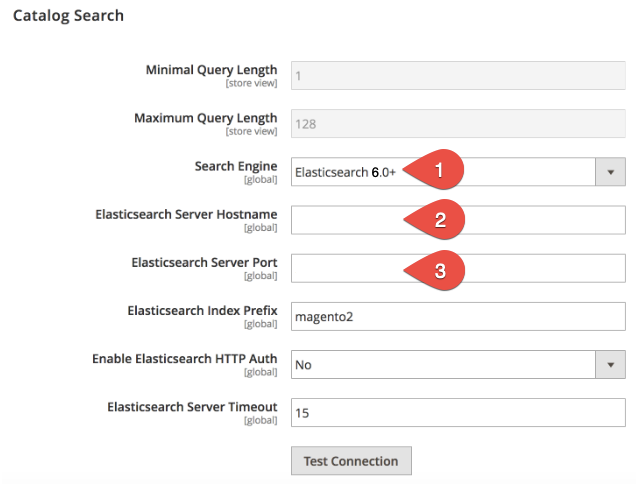 4. From the Search Engine drop-down list, select Elasticsearch 6.0+ (1). Fill the Elasticsearch Server Hostname (2) and Elasticsearch Server Port (3) fields. ATTENTION: If you are a Magento 2 Nexcess Cloud client, use the information provided in Step 4 of How to enable Elasticsearch for your Magento 2 Cloud account for the Elasticsearch Server Hostname and Elasticsearch Server Port fields. If you are using an Elasticsearch container with multiple sites then you need to pick a unique prefix or it will break the other site every time the cron runs.