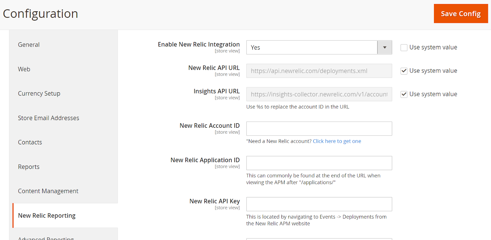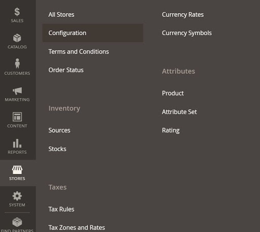 To connect New Relic to your Magento store, you will need to log in to your store. In the admin of your site, go to Stores > Settings > Configuration.