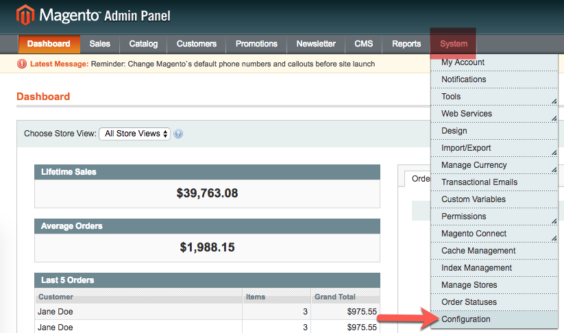 - From the Admin Panel, select System > Configuration.