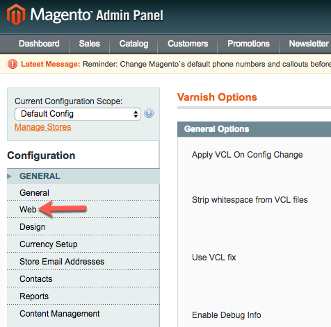- From the Configuration menu, in the General section, click Web.