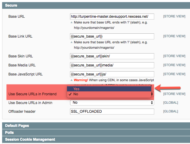 - In the Secure section, from the Use Secure URLs inFrontend drop-down list, click Yes. Though this step is not strictly necessary, it will make your site more secure.