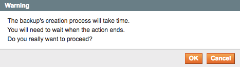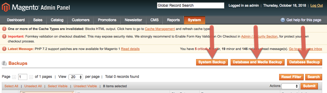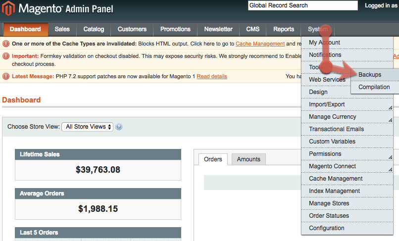 - From the Magento Admin Panel, select System > Tools > Backups.