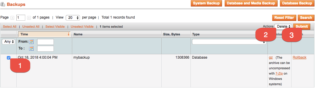 - You may view backups at any time by following Step 1. To delete a backup, select the corresponding check box, select Delete from the Actions drop-down menu, then click Submit.