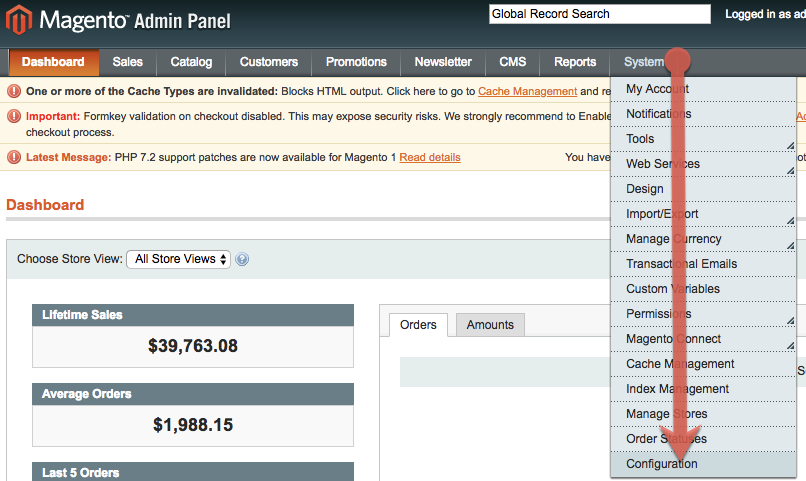 - From the Magento Admin Panel, select System > Configuration.