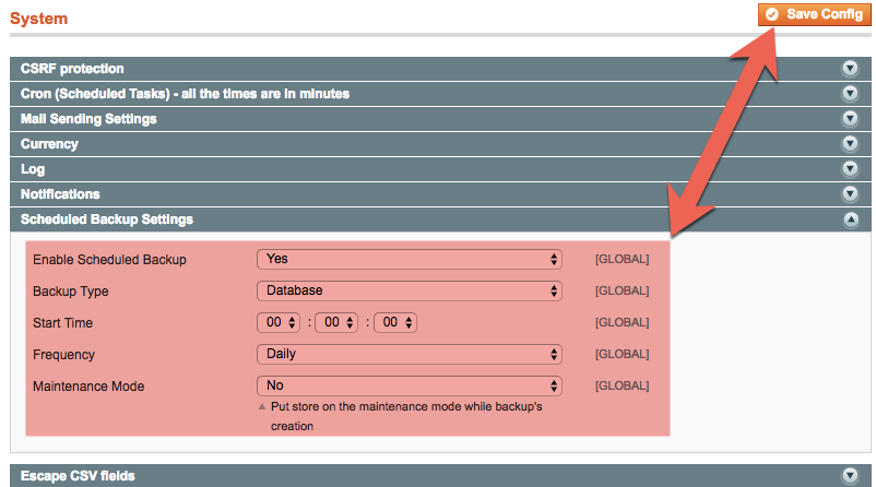 - Expand the Scheduled Backup Settings section. From the Enable Scheduled Backup drop-down list, select Yes. Designate your desired Backup Type, Start Time, and Frequency. If you wish to put your store into maintenance mode during these backups, select Yes from the Maintenance Mode drop-down list. Click Save Config when done.