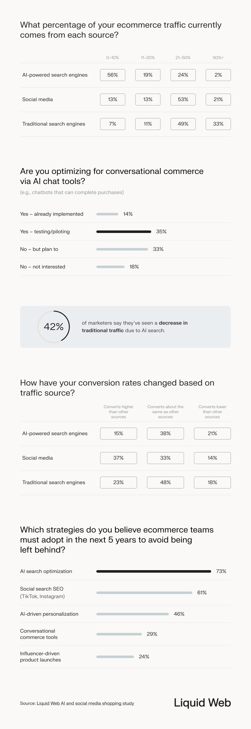 - 53% of marketers say 21-50% of their ecommerce traffic comes from social media, while 75% say up to 20% of their ecommerce traffic comes from AI-powered search engines; this suggests traffic is coming through alternative funnels.