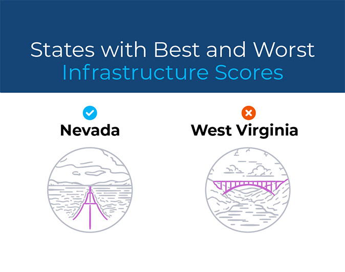 Ranking sixth overall, Nevada was scored a perfect 10 for infrastructure. The state took the number one spot for internet access and bridge quality. Power grid reliability landed them in spot number eight, and the state’s road quality rank landed them within the top 20 states.