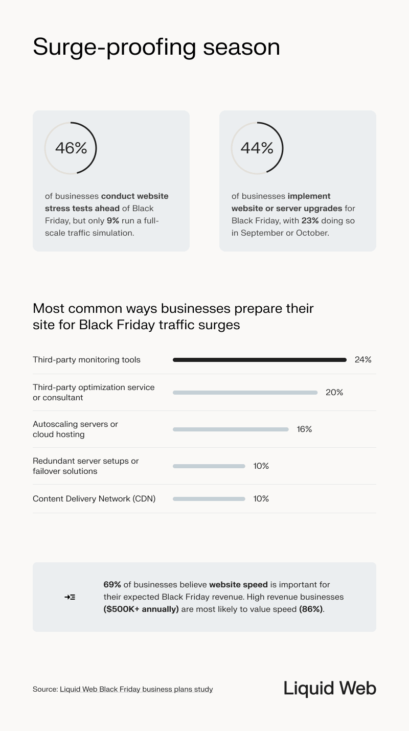 - Businesses are most likely to use third-party monitoring tools (24%) and third-party optimization services or consultants (20%) to prepare their site for Black Friday traffic surges.