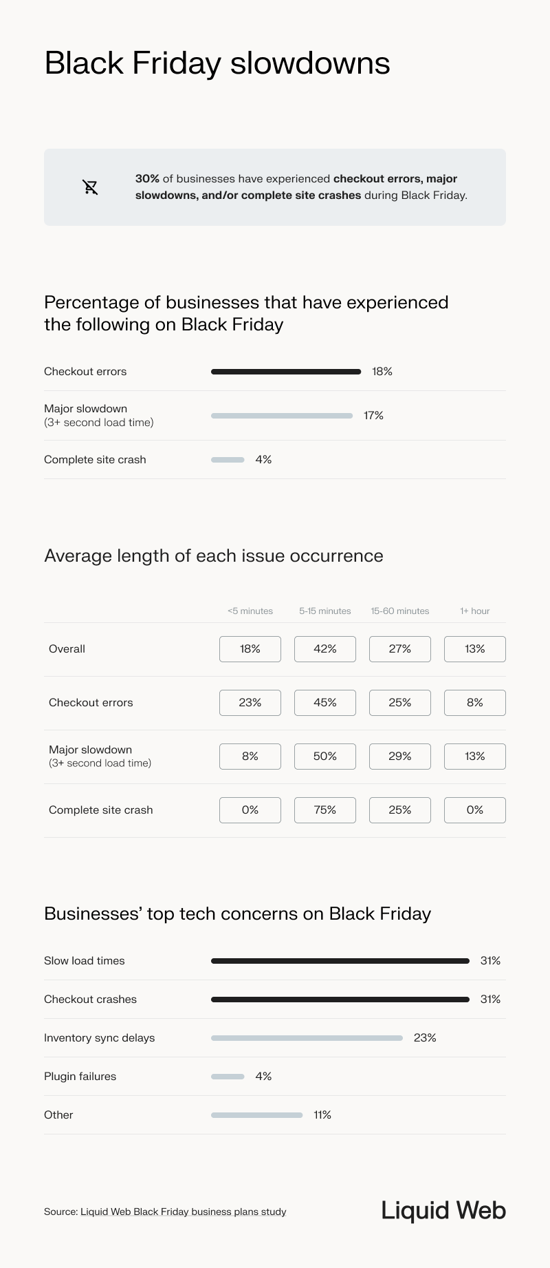 - 30% of businesses have experienced checkout errors, major slowdowns, and/or complete site crashes during Black Friday, with nearly 4 in 5 (77%) experiencing these issues multiple times.