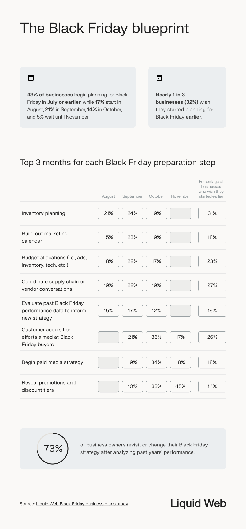 - Nearly 1 in 3 businesses (32%) wish they started planning sooner, especially when it comes to inventory planning, coordinating supply chain or vendor conversations, and customer acquisition efforts aimed at Black Friday shoppers.