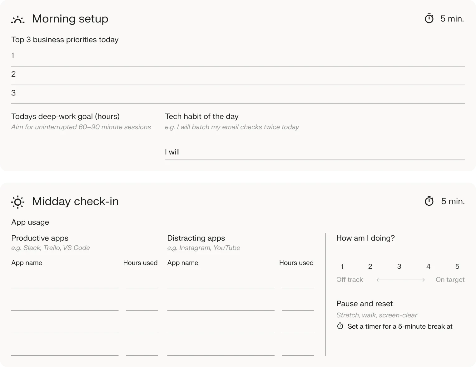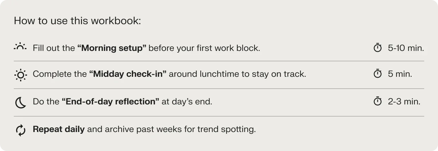 Consistency is the cornerstone of focus and productivity. Download and use this interactive workbook each day to record screen time, set deep-work goals, and reflect on wins and hurdles. Over time, you’ll spot patterns, eliminate distractions, and strengthen habits that fuel business success.