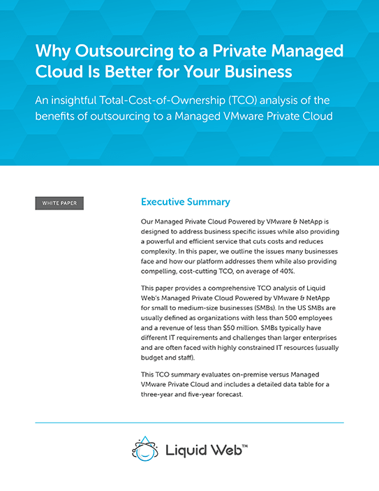 This paper provides a comprehensive TCO analysis of Liquid Web’s managed private cloud powered by VMware and NetApp for small to medium-size businesses (SMBs). In the US SMBs are usually defined as organizations with less than 500 employees and revenue of less than $50 million. SMBs typically have different IT requirements and challenges than larger enterprises and are often faced with highly constrained IT resources (usually budget and staff).