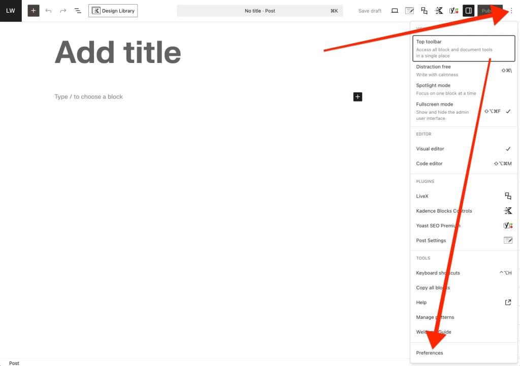 - If you don’t see the custom fields option, click on the three-dot menu in the editor, select Preferences, then enable Custom Fields under the “Advanced” section.