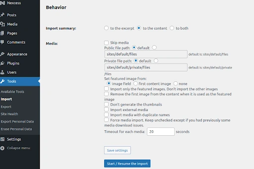 Next, you’ll need to configure how the plugin will import your Drupal post summaries and media files. You currently wind up at the Behavior segment of the relocation. Make sure everything is set up the way you want it.