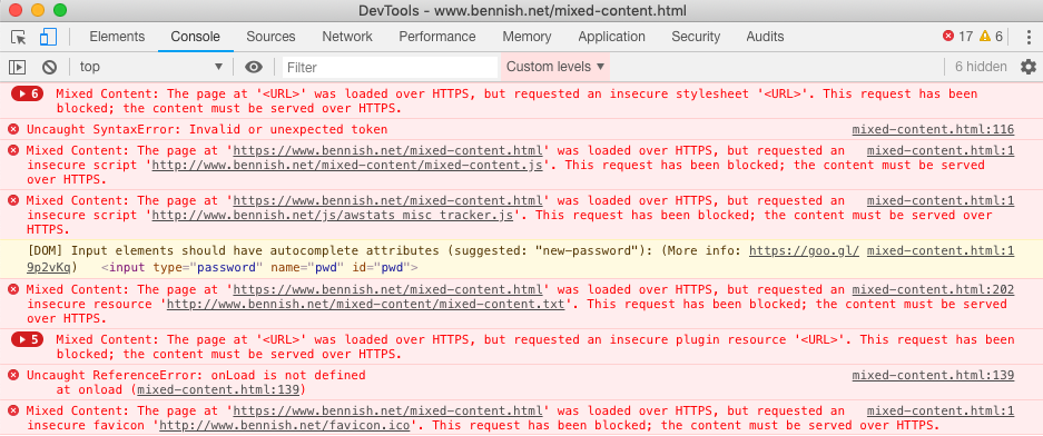 Browsers display mixed content warnings when an HTML page contains both HTTP and HTTPS content. They won’t load unsafe content in a supposedly safe environment. A fully-protected page is safe from snooping, but that can’t be guaranteed if there are non-protected elements on the same page. Browser developers want users to be aware of the risk to avoid instilling a false sense of security, so, in addition to blocking unsafe content, they display a warning. Google’s Chrome displays a warning icon in the space a padlock icon would appear for a secure site and a warning notification instructing users not to enter sensitive information such as passwords.