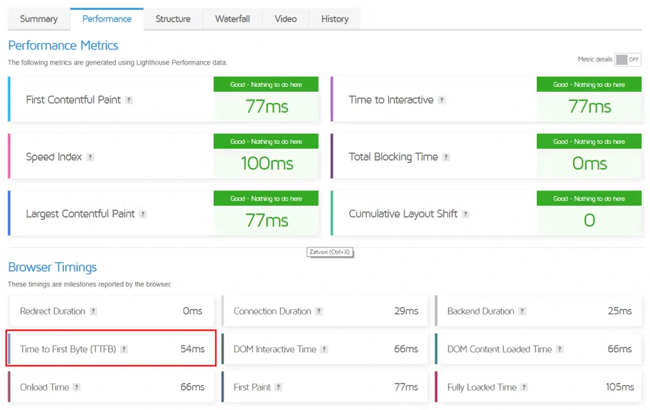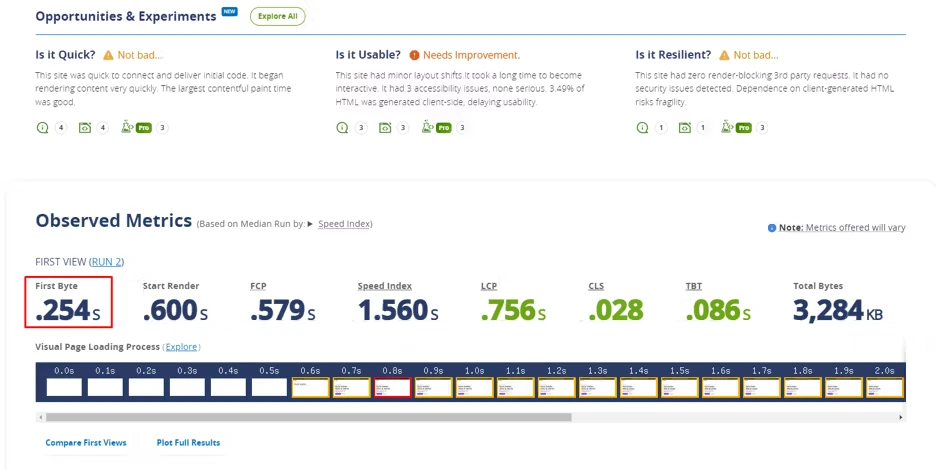 After the testing, you get a lot of useful information about your website. You can see an overview of its speed, usability, and resilience. Time to first byte can be found in the section below Observed Metrics.