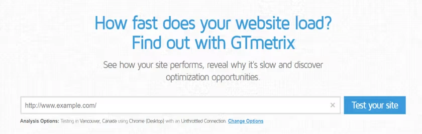 GTmetrix tests can be easily accessed. To start testing, paste the URL of your website in the text field and press Test Your Site as shown below.