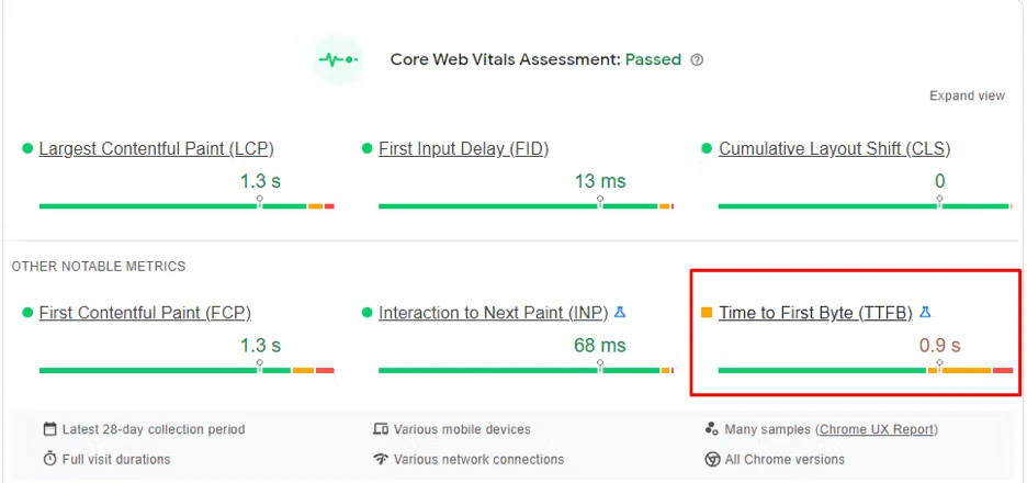 The test will show you if your website has passed or failed. Furthermore, it will show useful information including the Time to First Byte as seen in the screenshot below.