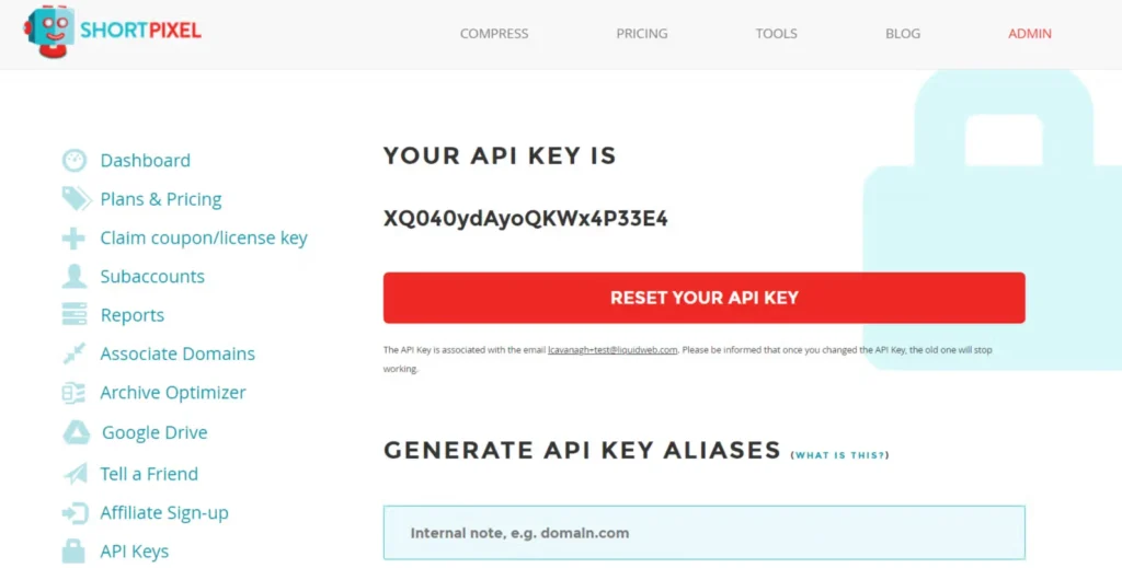 To find your API key, you will need to log in to your ShortPixel account and then go to the dashboard in the API keys section: