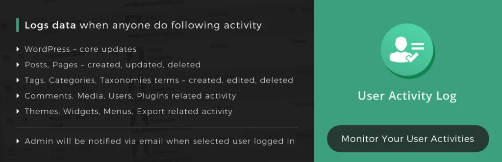 - Tracks post/page edits, plugin/theme activation, user logins