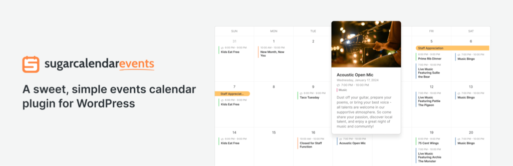 Sugar Calendar is a lightweight event calendar plugin focused on simplicity and speed. It’s not bloated with features you don’t need and has an intuitive UI that feels native to WordPress. It’s perfect for bloggers, nonprofits, and small business sites that just want to show events in a clean way.