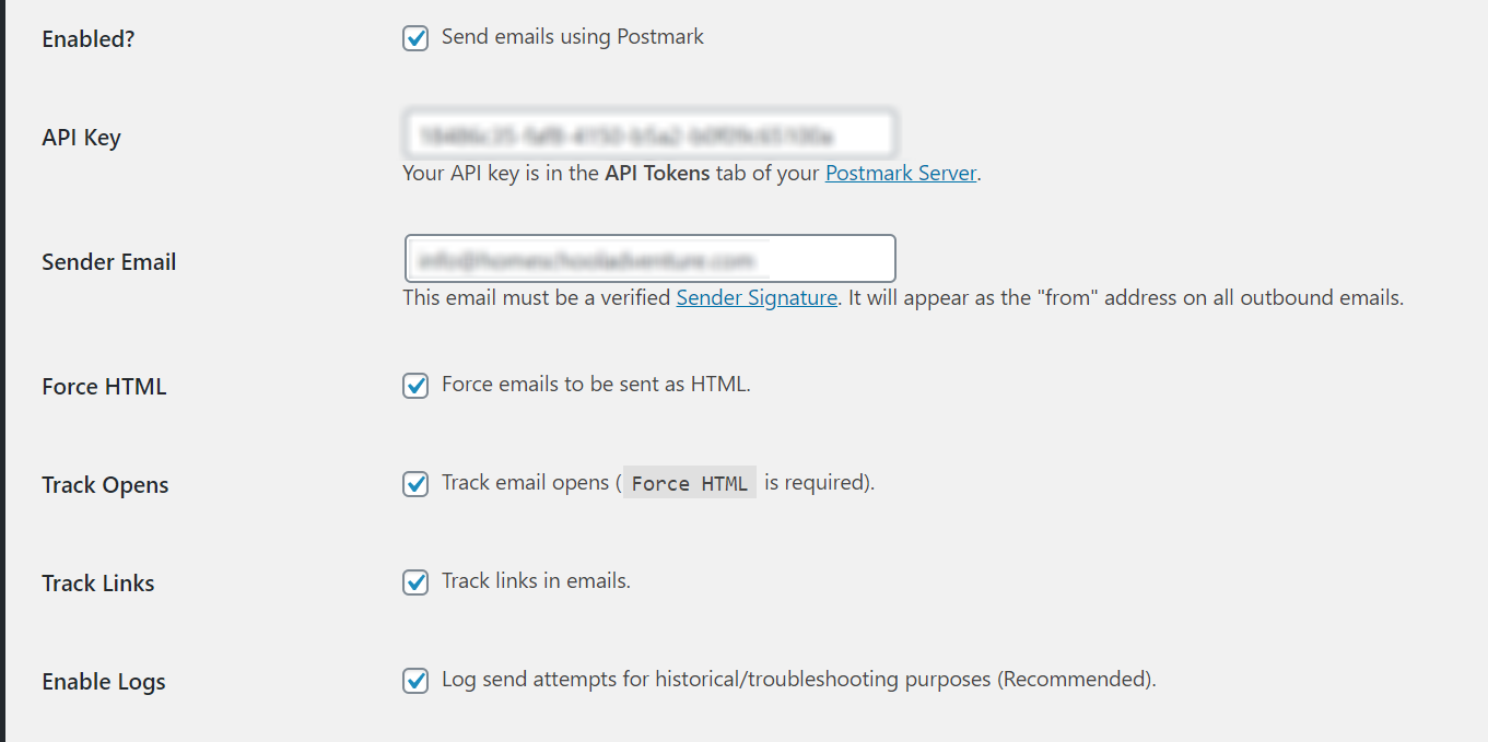 In the plugin settings you will need to sign up for Postmark and then copy in and save your Postmark API key as well as setting the sender email that you would site email to be sent from.